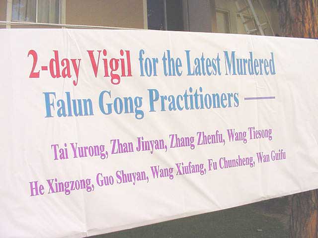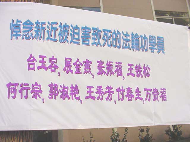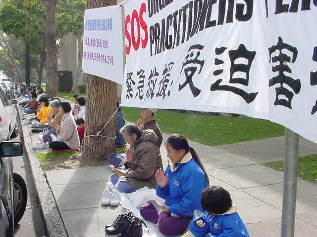 大法弟子炼功,发正念,慈悲祥和的场感动了路人。人们纷纷对江氏集团使用残忍的手段灭绝人性地对待法轮功学员表示谴责。一位过路的白人老太太,看起来有七十多岁了。她对大法弟子说,“我知道法轮功,我看到过关于你们的报导,我支持你们。”“愿上帝保佑你们,保佑中国,我会为你们的正义行动祈祷。”过路的卡车司机对递上大法材料的学员说,“一定要坚持下去,祝你们好运!”