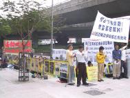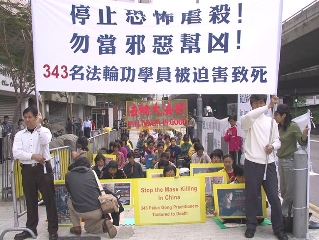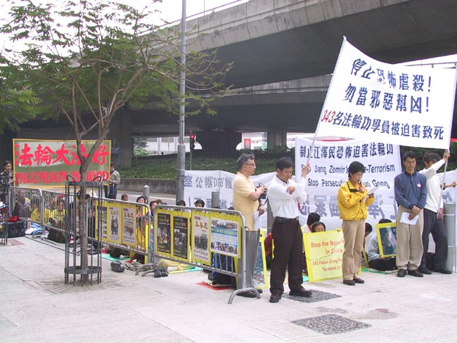 学员在中联办外打起"停止恐怖虐杀!勿当邪恶帮凶!343名法轮功学员被迫害致死"、"制止江泽民恐怖迫害法轮功"、"制止江泽民的国家恐怖主义"、"法轮大法好"等横幅,宣读了揭露与谴责江集团最近的滔天罪行的声明,和一些神人共愤的迫害致死个案。一些媒体对学员的活动进行了访摄。中联办内时而有人出来张望,越来越多人心里明白,不能再追随邪恶继续犯罪了。