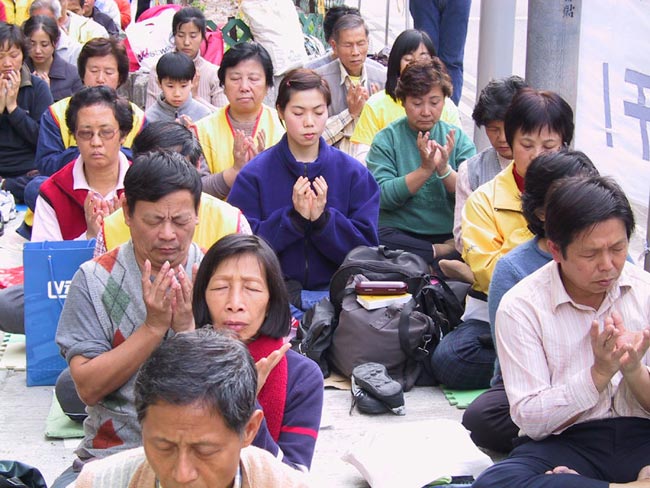 在新闻发布会后,静坐的学员交替着发正念和炼功,有力地清除着三界内残余的破坏大法的邪恶。