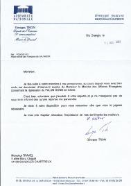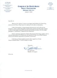 您在我办公室与我的会晤中希望我能向外交部长先生反映关于法轮功在中国被镇压之事。我很乐意接受您的请求,并且一有回音,我一定会告知您。