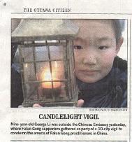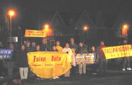 昨天,法轮功支持者们聚集在中国大使馆前,参加全球30个城市共同举行的烛光悼念活动,谴责对中国法轮功学员的虐杀。