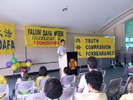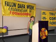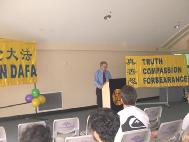 一位参加开幕式的当地居民,克利斯(Chris)听了几位学员的心得体会深有感触,禁不住走上讲台即兴发表感想,他说:“我听说法轮大法在中国受到迫害。从你们的言行中我更清楚地看到这种迫害是毫无道理的。真、善、忍,多么美好啊!如果世上的人都按真、善、忍去做,这个世界就会变得美好和平。”
