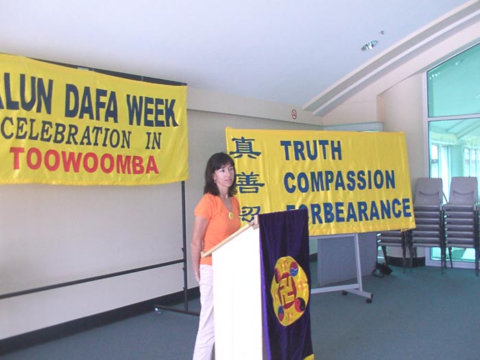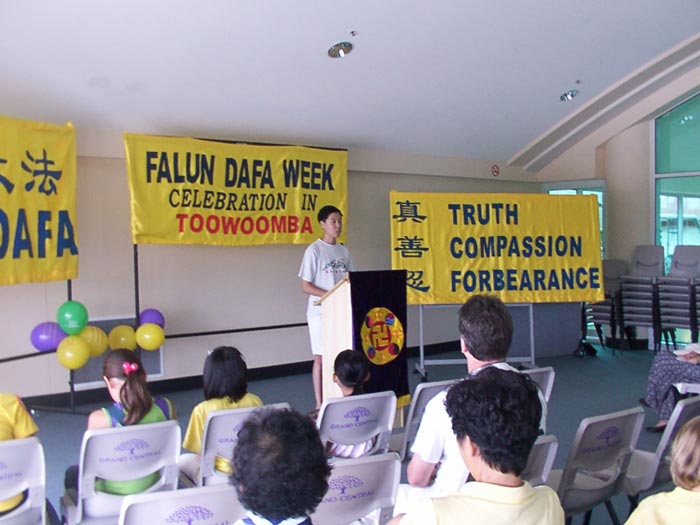图文巴市副市长伍德(Peter Wood)先生代表市长特劳蕾(Dianne Throley)女士出席了庆典并发言,他说:“今天我临时代表因紧急情况变化而不能出席庆典的市长来参加“法轮大法周”的开幕式,并转达市长因不能亲自参加开幕式的歉意以及她对“法轮大法周”的美好祝愿。法轮大法是中国传统气功修炼,以真、善、忍为宗旨,现在传遍50多个国家,有一亿多人在修炼,这说明法轮大法的世界性,普遍性。”接着他庄重地说:“我很高兴有此机会代表市长正式宣布二零零二年一月七日至十一日为图文巴市“法轮大法周” 。
