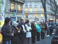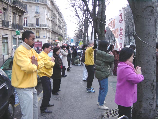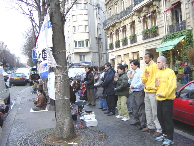 【明慧网2002年1月18日】今天,法国大法弟子分别来到中国驻法国大使馆、领事部,以和平的方式强烈抗议最近江罗集团对中国的法轮功学员的疯狂虐杀--22天竟然有20名法轮功学员被杀害,呼吁全社会、全世界帮助制止在中国针对法轮功学员的暴行。抗议活动将持续两天。