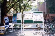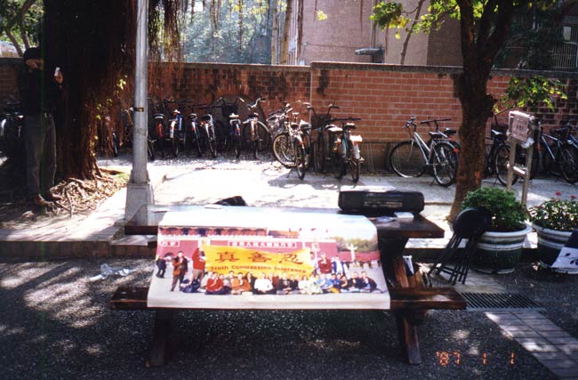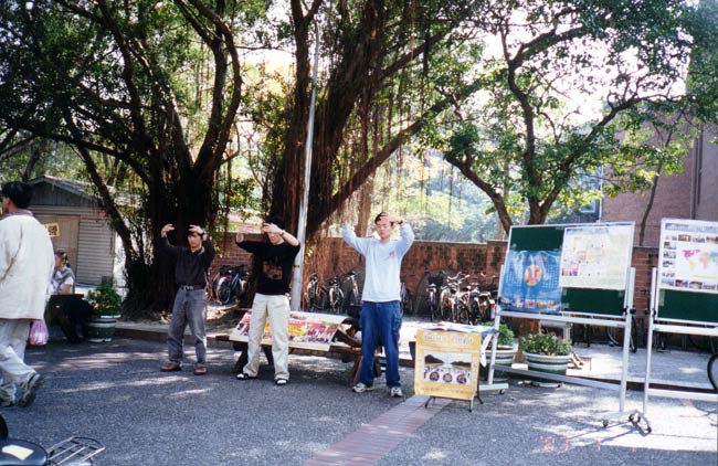 台大法轮功研究社是1999年底提出申请,2000年初通过,现在2002年初,社龄至今已有两年。为方便尚无早起习惯的大学生参加学功,在2001年成立中午时段的炼功点,地点就在台大学生中午用餐时段人潮汇集之处的「小福广场」,另一方面,为配合正法的进程、强化讲清真相的力度,台大法轮功研究社向校方申请为期两周的弘法活动。申请批准之后,在功友们的支援下,各式弘法材料、挂历、看板架等等都陆续汇集起来,并在每日中午下课铃声作响之前便将场地布置好。几乎能抽空来的法轮功研究社成员都到齐了,大家分工合作进行功法展示或发送传单、讲清真相。