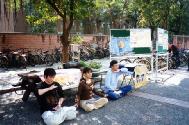 每天中午天气都相当好,金黄色「法轮大法(法轮功)义务教功」的横幅,与36位西人学员在天安门广场上拉「真善忍」横幅的巨幅海报方正地展示着,大法音乐「普度」、「济世」以及「得度」、「如梦令」等四首大法弟子创作的音乐,回荡在小福广场的空间四周,想起师父正法之路的艰辛与伟大,心里觉得非常的殊胜、眼里溢满了感动的泪水。在我们的摊位附近还有其他社团与外来厂商的摊位,他们也是我们弘法的对象,能有机缘被安排在同一时间、同一地点办活动,这都不会是偶然的。有一个来台大销售英文杂志的阿姨,我们向她分享了得法后身心健康的好处之后,她颇感兴趣地表示她要去住家附近的九天班看看,台大校园里外国人也挺多的,我们也替他们准备了英文大法简介。