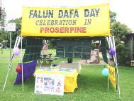 在我们搭好台子,布置好图片展之后,普鲁士畔市长马里奥.迪马逖尼先生(Mario Demartini)突然来到,并作了自我介绍。他告诉我们,他会在上午11:00带着褒奖声明回来。快到11:00时,当地报纸的记者出现了,问我们是否可以拿一些我们炼功的照片。我们借此机会向她洪法并向她讲清法轮大法的真相。我们将《为法轮大法呼唤正义》录像带和其他阅读资料交给市长和当地报社记者。