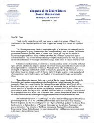 持续的对法轮功的镇压是一个更加令人担忧的中国政府问题。作为国会中国际关系委员会及人权小组的成员,你尽管放心,我会在国会讨论有关问题时记住你所关注的(法轮功)事件。