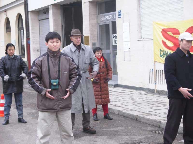 天气十分寒冷,雷根思堡的学员赶来支援,得法不久的70多岁的老学员来了,有的学员带着4,5岁的孩子也赶来了。在领馆对面,弟子们一遍又一遍地发正念,清除邪恶,一遍又一遍地演示功法,将大法的美好展现给世人。一位年轻的警察从车上跳下来,走向我们,“我一直在看你们,你们的动作太美了!能给我一份报纸吗?因为上面有动作图解,我也想学法轮功。”