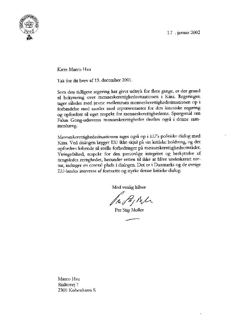 正如上届政府曾多次表示过的,中国的人权状况的确有值得关注的理由。因此,(丹麦) 政府在与中国政府的代表会谈时一直不断地提出人权问题,敦促中国政府高度尊重人权。同样,有关法轮功学员的人权问题也包括在讨论中。在欧洲同盟与中国政府的政治对话中,人权状况问题同样也被提上议事日程。