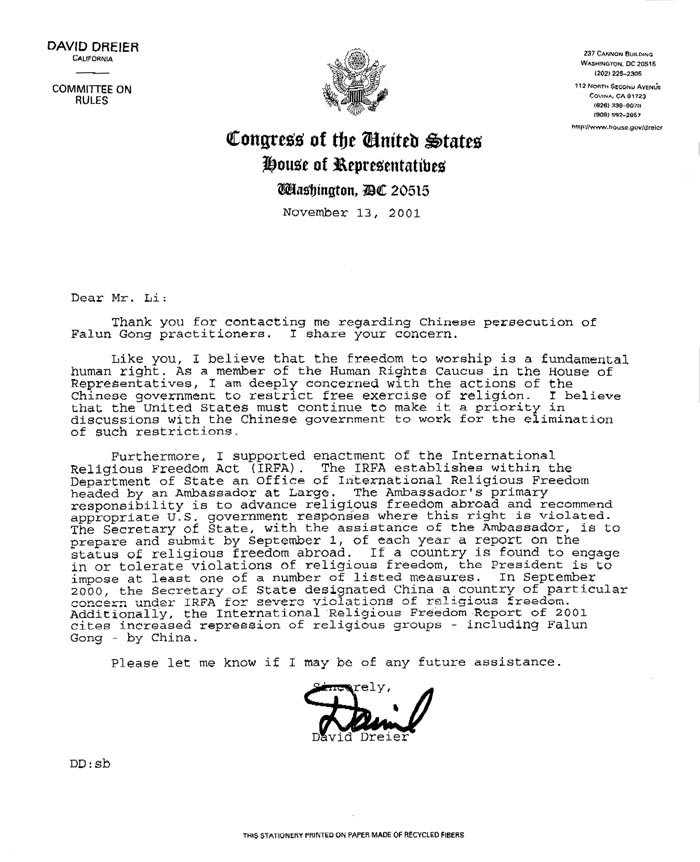 象您一样,我认为信仰自由是一项基本人权。作为国会众议院人权委员会成员,我极度关注中国政府禁止宗教自由的行为,我认为在同中国政府的对话中,美国必须始终把此事作为讨论的首要议题,以努力消除这些限制。