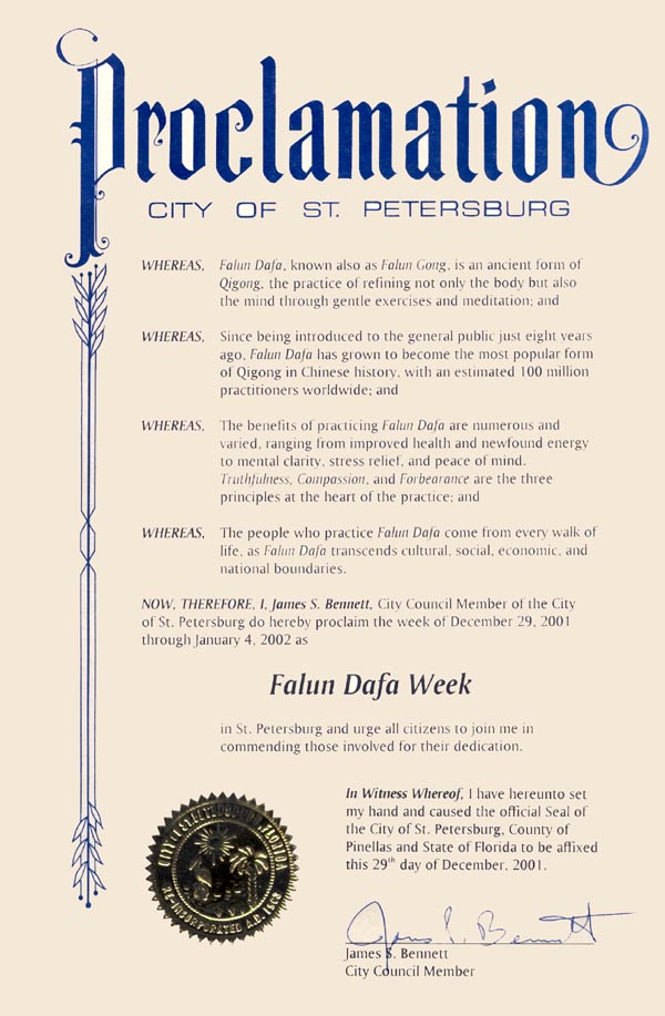 佛罗里达州圣彼得堡市宣布“法轮大法周”