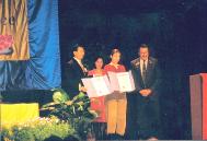 在颁发褒奖后,学员代表向市政府赠送了法轮功书籍和教功录像带。