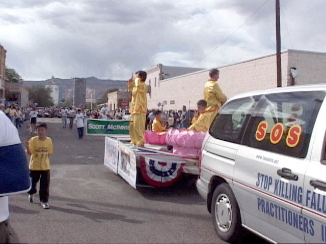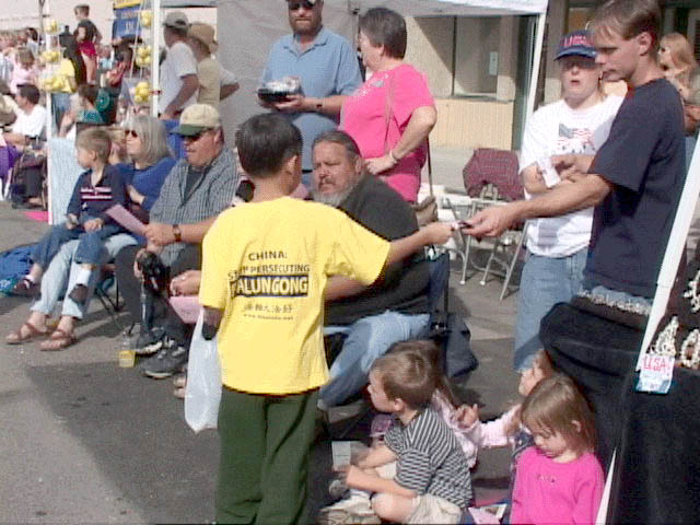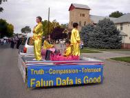 9月28日,部份科罗拉多州大法弟子驱车四个小时参加了科州福路泰(FRUITA)山村小镇的金秋节游行。在这个偏远的小镇,大法弟子的彩车及功法表演受到纯朴村民的欢迎。人们争相阅读材料,在呼吁布什总统帮助制止镇压的明信片上签名。特别值得一提的是两位小弟子的一丝不苟的表演博得阵阵掌声。小弟子在这次活动中发挥了很大作用,另一位小弟子今天发了不少真相资料。特别巧的是科州联邦众议员SCOTT MCBEES的辅选队伍就在大法弟子的彩车之后,游行前弟子对他们进行了洪法及讲真相。