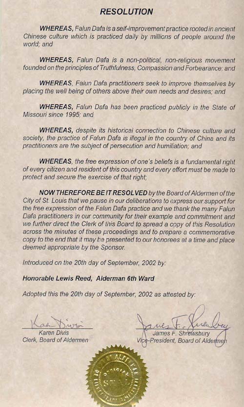 市议会决议说:法轮功是基于真善忍的修炼方法,倡导先他后我,使修炼者心灵升华;密苏里州大众自1995年开始自由修炼法轮功,而在中国却被禁止和迫害;言论自由是这个国家每个公民的基本权利,我们支持为这个权利所做的每一份努力;市议会支持法轮功的言论自由并嘉奖法轮功学员为此所树立的榜样,及感谢法轮功学员对社区的贡献。
