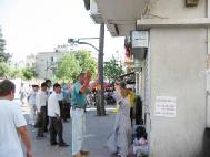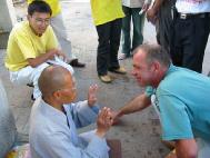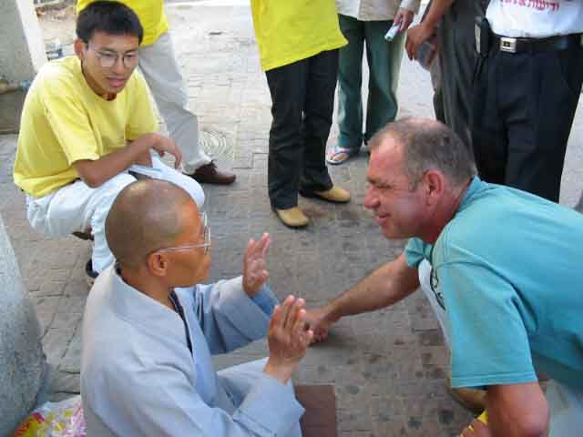 【明慧网2002年10月12日】周末,我们来到在特拉维夫(Tel Aviv)中国人聚集的地方介绍法轮功真相。当法轮功学员们在一起演示功法时,忽然来了一位大个子的俄罗斯裔以色列人,站在一位台湾出家人大法弟子面前,和她一起炼功。虽然动作根本不准确,他仍炼得专心致志。