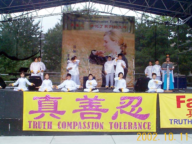 表演正式开始了。节目有孩子们的功法演示,古筝演奏,舞剑,表演唱,舞蹈等。一西人学员向在场的公众介绍了法轮功的起源,他在加拿大和世界范围内受到的欢迎和在中国受到的残酷迫害,以及由加拿大学员发起、如今已成为全球性的“紧急救援受迫害的法轮功亲属活动”。这个营救活动是这一天的主题之一。在过去的三年中,加拿大政府和人民都强烈谴责中国江氏集团对和平的法轮功学员的残酷迫害,并向中国的法轮功学员伸出了救援之手。张昆仑教授、朱颖女士和林慎立先生先后被营救成功返回加拿大。最近,加拿大居民吴艳霞的妹妹吴艳英和加拿大居民王延英的先生邱兆金都分别被营救出狱。在中国,成千上万的家庭由于江氏政府对法轮功的残酷镇压而支离破碎,数百万人被剥夺了最基本的人权。法轮功学员向公众征集在明信片上签名,希望加拿大总理能在本月于墨西哥召开的APEC会议上发出加拿大人民的心声:停止对法轮功的迫害、释放所有被关押的法轮功学员。