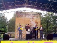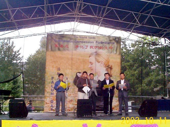 侨领洪先生一大早就来到了活动现场,他是“法轮功之友”的发起人之一。他被现场的气氛所感染,即兴写了一首歌词,并和法轮功学员、原沈阳军区歌舞团女高音独唱演员白雪到舞台上演唱了这首歌。