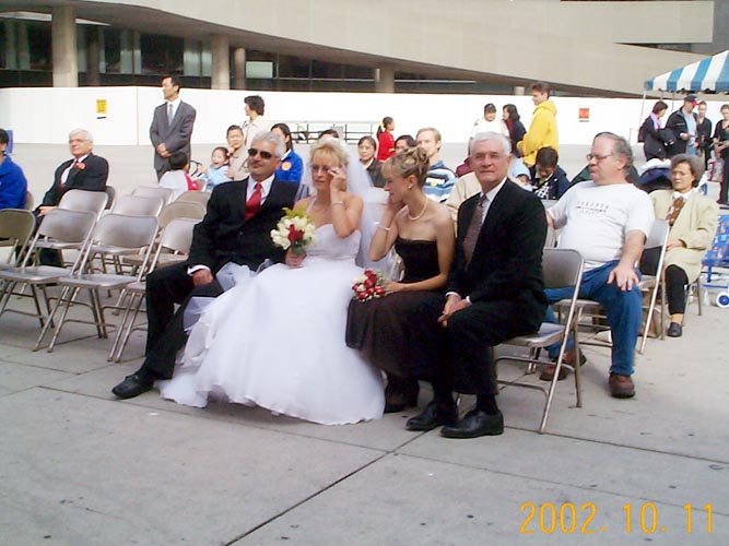 节目在继续,一对盛装的新人及他们的亲朋好友来到广场。他们被正在进行的活动所吸引,新人坐到观众席上观赏节目,这时,主持人乔通过麦克风向他们献上来自法轮功学员的祝福,祝他们的婚姻有“真、善、忍”相伴左右,愿法轮大法的光芒笼罩着他们。后来,新郎新娘还在“法轮大法”的字样前合影留念。