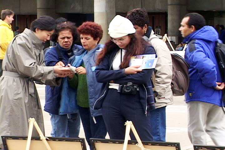 广场四周的学员们也不失时机地和他们攀谈,适时地向他们介绍大法在国外洪传的盛况,告诉他们大法在加拿大受到上自总督,下至各级议员的欢迎和支持。他们虽然什么也不说,却也都听着,好奇地看,各种材料都接,也有人很好奇地问学员们的情况,想知道我们都是做什么的,以什么为职业。一位学员就告诉他们:“我本人是会计师,台上那位为你们解说的学员是工商管理硕士,海外的法轮功学员中许多都是高学历的,我们都有自己的工作和生活。”一位厦门来的小伙子在现场呆了一个多小时,和一位原籍台湾的法轮功学员攀谈,学员告诉他法轮功在台湾洪传十几万人的盛况,告诉他法轮功作为一种传统的中国文化,受到了全世界人民的欢迎。一位干部模样的人听学员讲了很久,直到他团队里的人来拖他走时,仍恋恋不舍地一边走一边接旁边学员们递上去的资料。