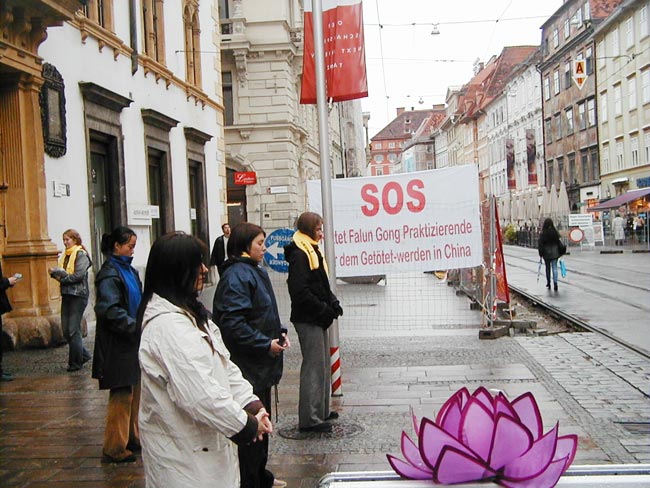 【明慧网2002年10月16日】10月12日在奥地利的大法弟子在格拉茨市以“真善忍──和平的源泉”为主题举行了游行和信息日。这一天虽然下雨,却丝毫没有影响活动的进行。街上常常是一群一群的人走向大法弟子了解真相。一些华人惊讶地看到这里也有大法弟子,并很高兴地接受了真相材料,有的还进一步了解怎么开始修炼。这一天有几千人通过真相材料和与大法弟子交谈直接了解了大法、了解了在中国对大法的