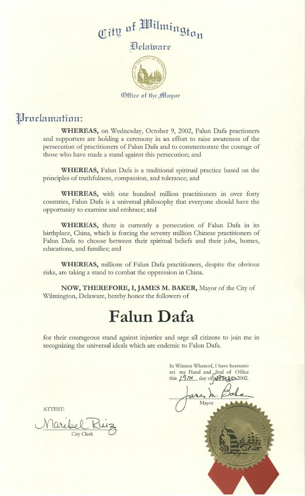 鉴于,法轮大法学员和支持者们将在2002年10月9日举行了一个仪式,以期引起更多的人关注法轮大法学员所遭受的(江氏集团的)迫害,并表彰那些起来反对这场迫害的人们的勇气;并且