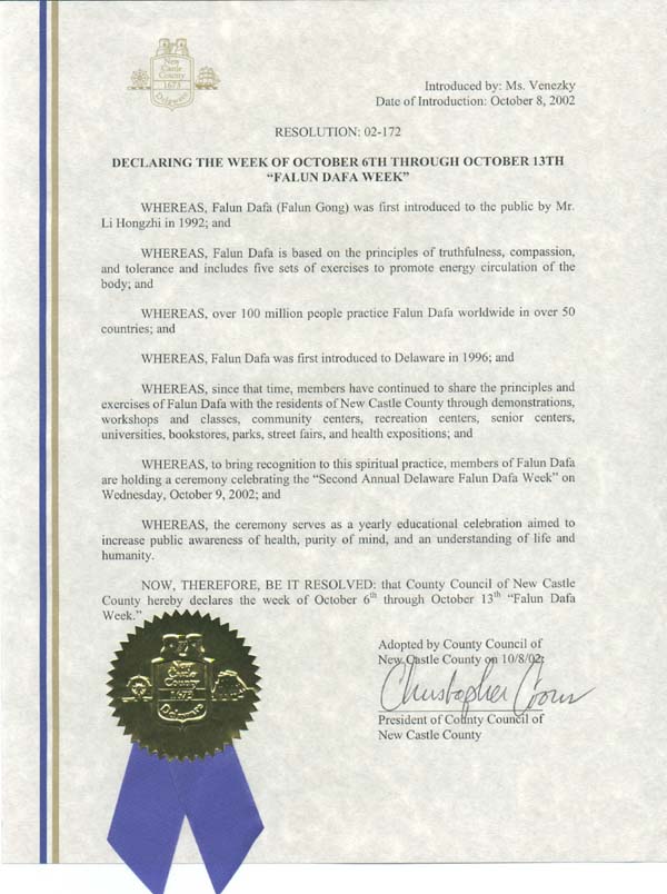 特拉华州新城堡郡议会决议,将2002年10月6日至10月13日定为“法轮大法周”