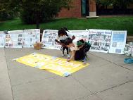 展板上贴有法轮功学员被酷刑折磨的真实照片。许多过往行人看到了照片不由地放慢了脚步。当他们知道这是为支持被迫害的法轮功学员而征集签名时,都毫不犹豫地在上面签上了自己的名字。短短两个小时就征集了几百个签名。