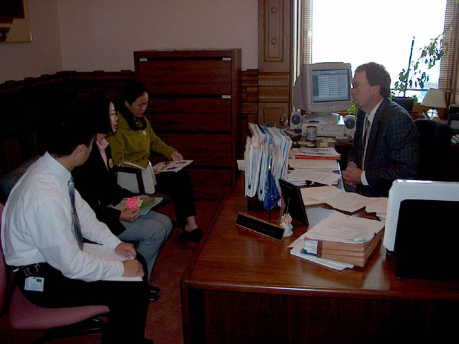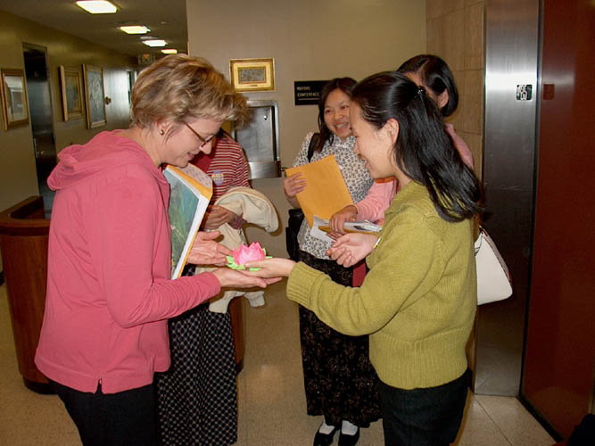向州司法部长特别助理拉里先生讲真相向市长特别助理莫瑞斯女士赠送莲花