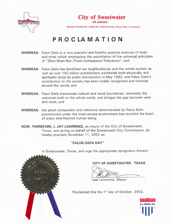 鉴此,我,德克萨斯州甜水(Sweetwater)市市长杰·劳伦斯(Jay Lawrence),代