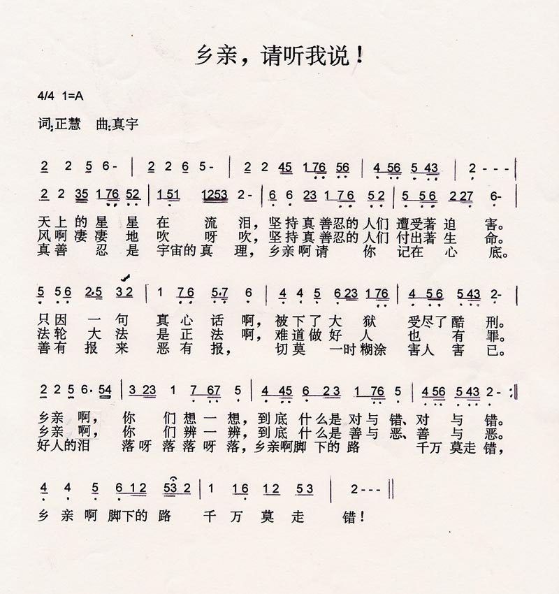 “真、善、忍”是宇宙的真理,乡亲啊请你记在心底。善有报来恶有报,切莫一时糊涂害人害己。好人的泪落呀落、落呀落,乡亲啊脚下的路千万莫走错,乡亲啊脚下的路千万莫走错!