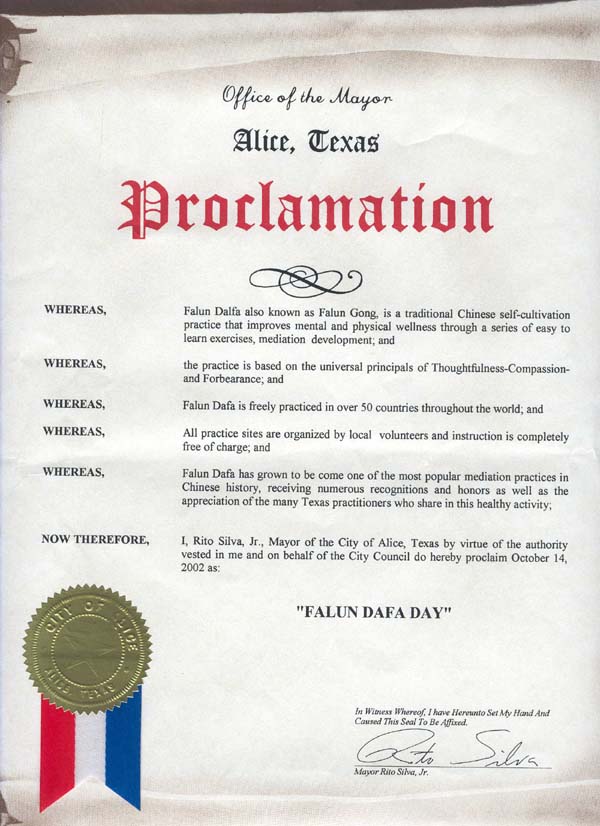 鉴此,我,利多.小斯尔瓦(Rito Silva, Jr),德克萨斯州艾丽斯市市长,以市长的名义,并代表市议会,特此宣布2002年10月14日为