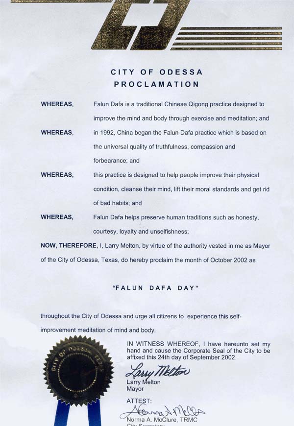 德克萨斯州奥德萨市市长宣布“法轮大法日”