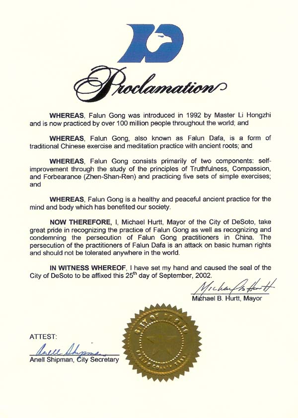 鉴此,我,麦克-赫特(Michael Hurtt),德克萨斯州德索托(Desoto) 市长,极其荣幸地褒奖法轮大法和中国的法轮大法修炼者,谴责在中国发生的[江氏集团]对法轮功的迫害。对法轮大法修炼者的迫害是对人类基本人权的侵犯,这在世界任何地方都是不能容忍的。