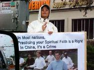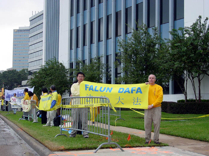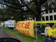 图片报道:法轮功学员在江氏所在的休士顿洲际酒店周围抗议