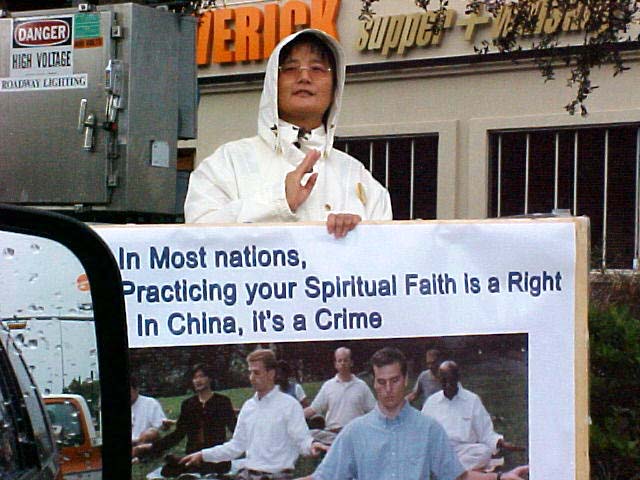 法轮功学员在洲际酒店周围沿路抗议