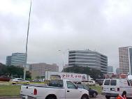 【明慧网2002年10月24日】10月23号上午,500余名法轮功学员在江XX即将进入的休士顿洲际酒店四周沿路集体抗议,学员们的黄色上衣和打出的横幅随处可见。