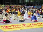 记者会除了美中地区的法轮功学员外,还有来自澳洲、加拿大、欧洲、日本、新加坡以及台湾的法轮功学员前来会合,齐声向江XX抗议。