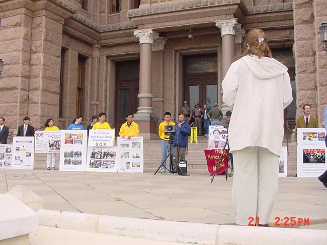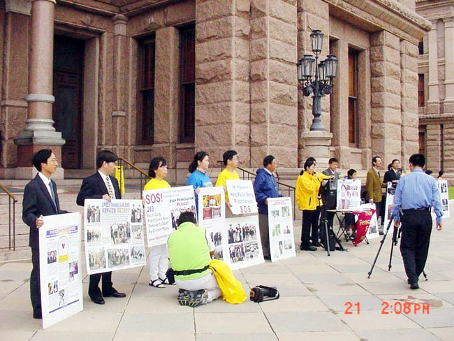 学员手举江XX流氓政府迫害法轮大法及大法学员的多幅照片展板,祥和、肃穆地在州政府前向奥斯汀市民、媒体、世界各地游人展示了大法学员风貌及大法在中国蒙受残酷迫害的千古奇冤,江氏暴行历历在目、铁证如山、催人泪下。