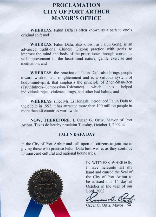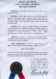 德克萨斯州阿瑟港市市长办公室宣布“法轮大法日”