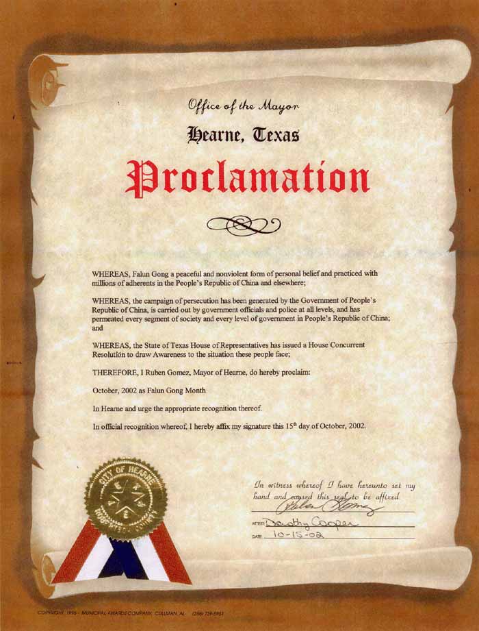因此,我, 鲁班·戈姆兹(Ruben Gomez),希尔尼市市长,在此宣布2002年10月为希尔尼市的法轮大法月