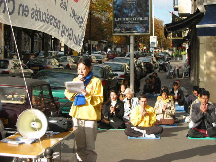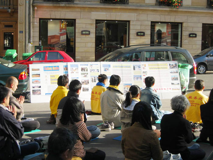 为让更多的世人了解江XX政治流氓集团对法轮功的迫害,为使这场荒谬的迫害早日得以制止,23日下午,法国法轮功学员来到中国驻法国大使馆前进行和平请愿活动。活动期间,学员用中法文宣读了六国法轮功学员(包括一名法国学员)联名起诉江XX的声明;学员们还频发正念,用功能铲除在另外空间操控恶人干坏事的邪恶因素。