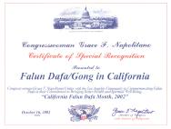 加州国会议员纳波利塔娜女士“加州法轮大法月”之际褒奖“加州法轮大法/法轮功”。