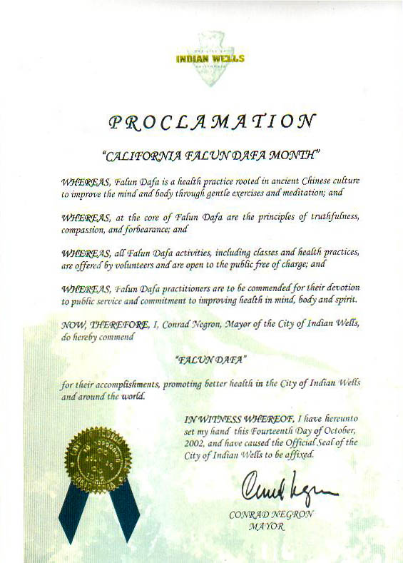 鉴此,我,康瑞德.尼格龙(Conrad Negron),印第安.韦尔斯市市长,特此表彰