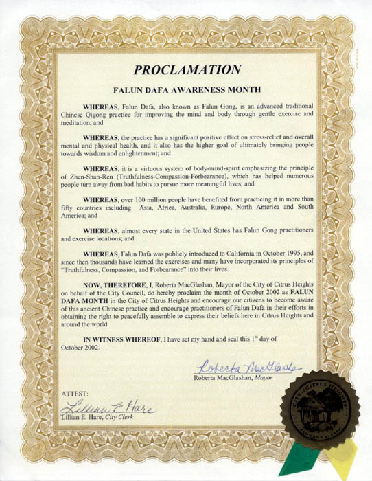 因此,现在,我,罗波塔-麦可格拉山(Roberta MacGlashan),色特拉斯-海茨市市长,代表市政厅,宣布2002年10月为色特拉斯-海茨(Citrus heights)市法轮大法月,而且鼓励我们的公民了解这一古老的中国修炼,并奖励法轮大法学员为获得在色特拉斯-海茨市及在全世界和平集会表达他们的信仰所做的努力。