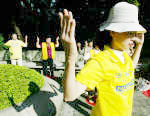 墨西哥公路警察注视着,但没有对大约20名左右的示威者采取行动,一些示威者穿着他们特有的印有“中国──释放被关押的法轮功学员”的黄色T恤衫。他们在马路边盘腿打坐,双手合十。