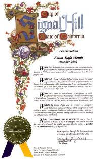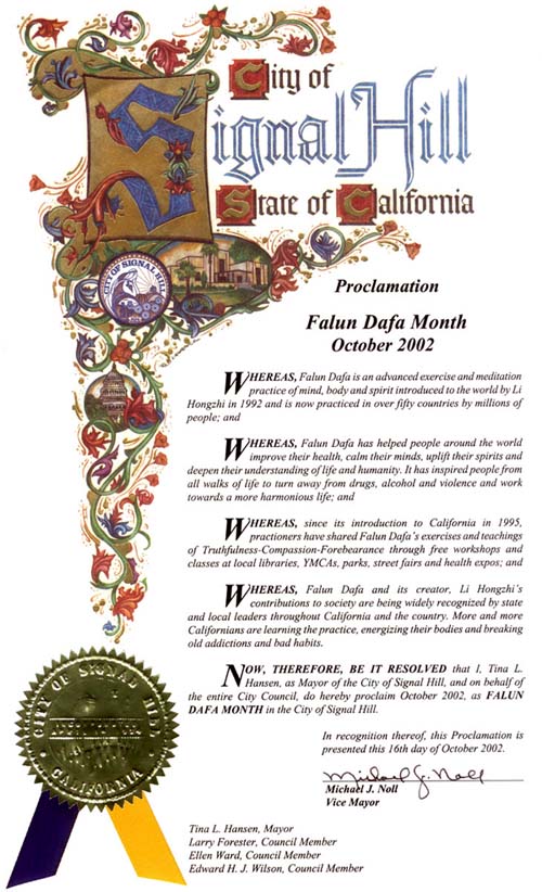 【明慧网2002年10月27日】加州斯格乐-赫尔(Signa Hill)市市长宣布2002年10月为该市的“法轮大法月”。
