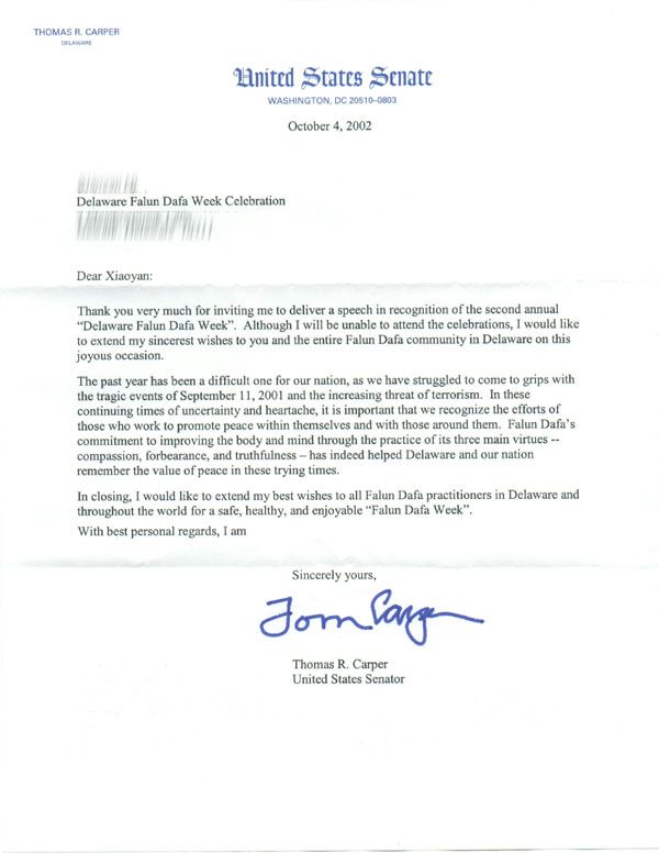 去年对于我们国家来说是困难的一年,我们艰难地应付2001年9月11日发生的悲剧及日益加剧的恐怖主义威胁。在这样持续性、莫测的、令人头痛的日子里,我们表彰那些在个人及周边人群里倡导和平而做出的努力,这很重要。法轮大法致力于通过对真善忍三个主要美德的实践来提高身心,在(目前)这样艰难的时候,这的确帮助了特拉华州和我们的国家记住和平的价值。