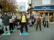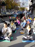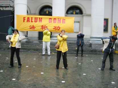 这时我看到旁边有个西方学员,没打横幅标语,坐在地上专心发正念,我也加入他的阵容。大约一小时后,我们睁开眼睛,发现第一排的欢迎团都把红旗扔在地上跑掉了,抬头一看,雨过天晴,往旁边一看,我们这一区的功友全部坐下来发正念。我们一句话也没有说,发完正念那些欢迎团的成员自动撤横幅标语。