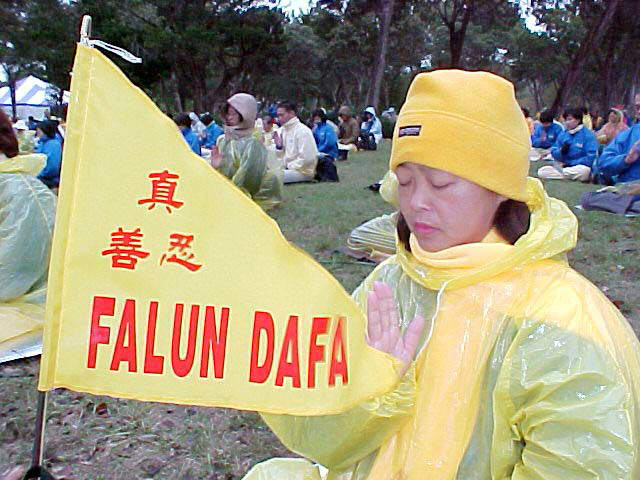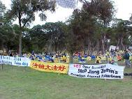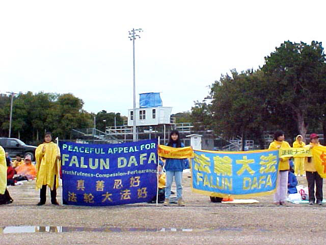 【明慧网2002年10月29日】2002年10月25日,世界各地1500余名法轮功学员冒着阴雨在克劳福得和平抗议江泽民一伙对中国法轮功学员的残酷迫害